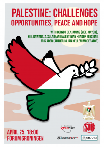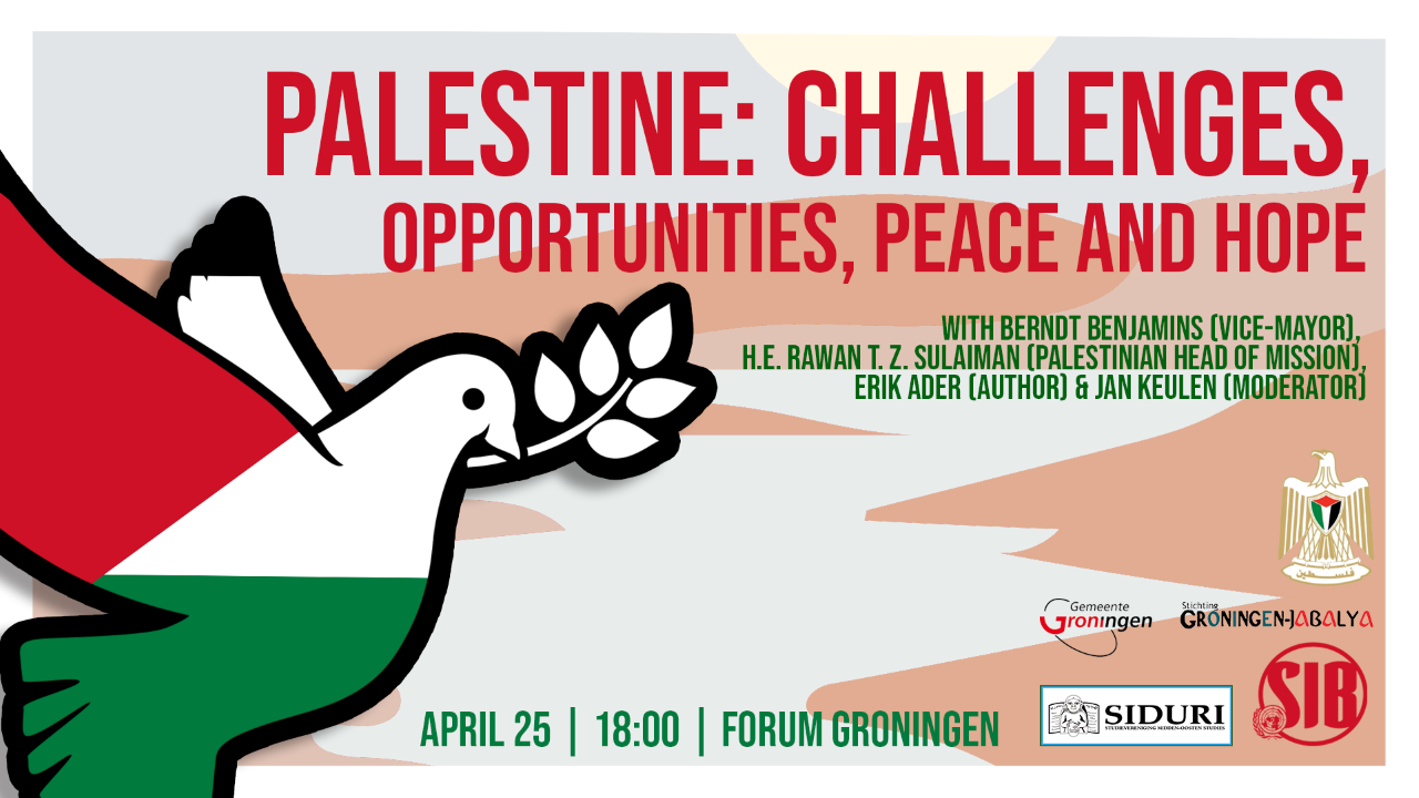 Na de Oslo-akkoorden ontstond wereldwijd hoop op vrede tussen Israël en Palestina op basis van een tweestaten oplossing. Er werden veel initiatieven gelanceerd om Palestijnen te ondersteunen bij het opbouwen van een staat; gemeenten in Nederland, waaronder Groningen, waren bereid Palestijnse gemeenten te helpen met technische en bestuurlijke kennis. Groningen richtte zich op het jeugdbeleid van de gemeente Jabalya in de Gazastrook en de bouw van een jongerencentrum daar. Waar staan we nu negenentwintig jaar na de Oslo akkoorden? In samenwerking met de gemeente Groningen, Studievereniging Siduri, SIB groningen, Stichting Groningen-Jabalya en de Palestijnse Missie in het Koninkrijk der Nederlanden nodigen wij u uit voor een evenement om de uitdagingen en kansen voor vrede en hoop in Palestina te bespreken.