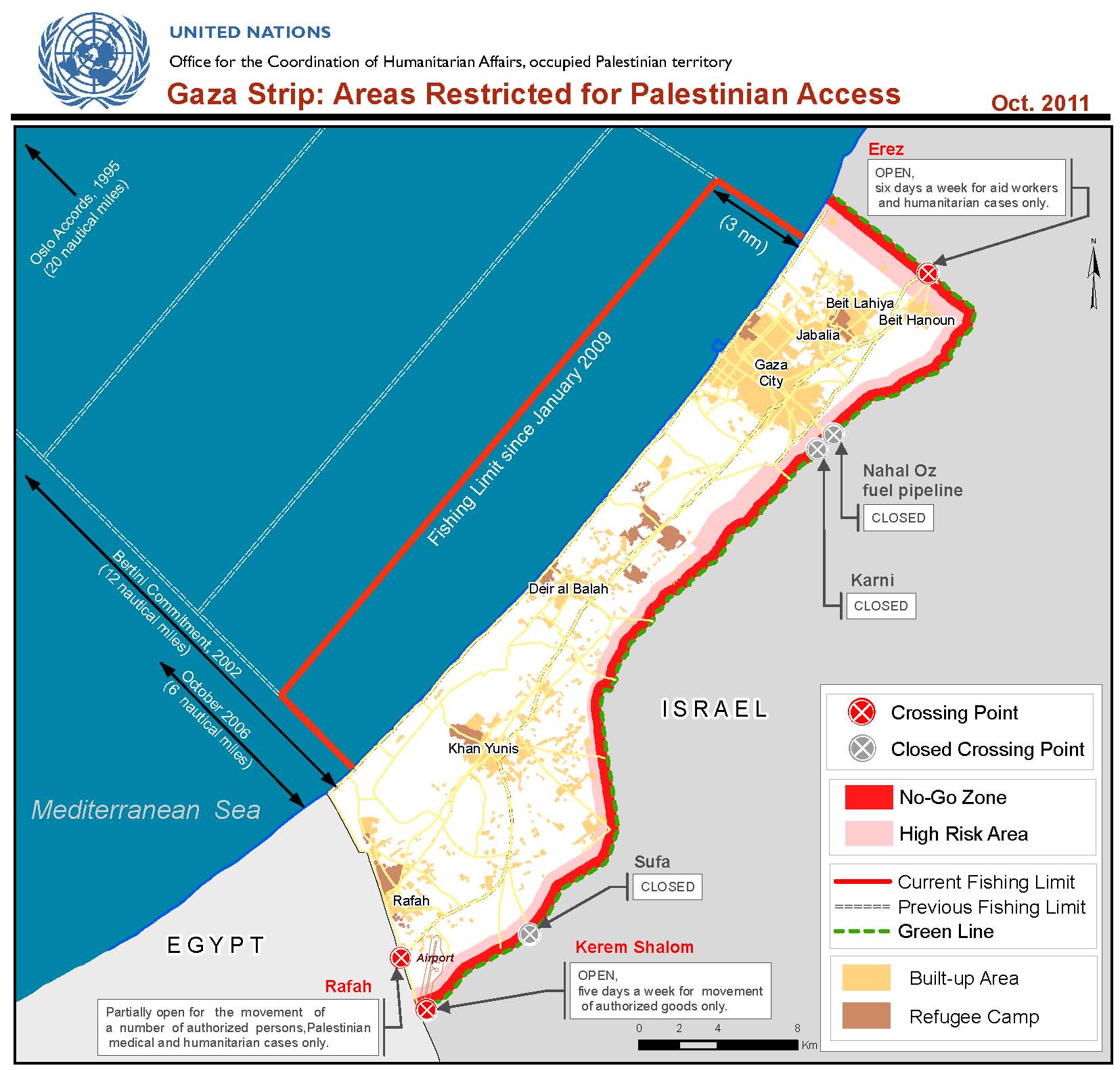 De enige twee toegangsmogelijk-heden voor de Gazanen zelf zijn bij Rafah in het zuiden en Erez in het noorden. Maar om Gaza uit te komen is er een vergunning nodig, en die wordt sinds de verkiezingsover-winning van Hamas in 2006  vrijwel niet gegeven. Als reactie op de verkiezingsuitslag sloot Israel de Gazastrook namelijk hermetisch af.  De grensposten zijn uitgestorven, alleen buitenlanders en diplomaten mogen er in en er uit, via de aparte ingang voor ‘VIP’s’ die de Palestijnen niet mogen gebruiken. Voor een beperkte groep Gazanen die naar het buitenland kunnen reizen gaat de route tegenwoordig via Egypte.