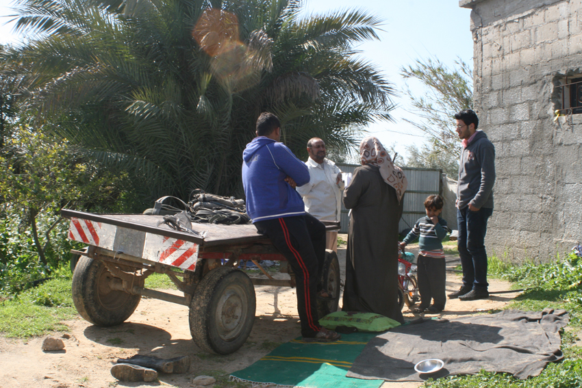 De familie Huthut, die op een paar kilometer van de grens woont, vertelt over de problemen die zij ondervinden als gevolg van het wonen aan de grens. Met een bittere zucht, begint Oum Tarek Huthut te vertellen over wat zij en haar gezin hebben meegemaakt tijdens de laatste oorlog in Gaza. Zij zegt: ”Dat waren de ergste dagen van ons leven. Wij woonden zo dicht bij de grens dat elke beweging van ons in de gaten werd gehouden. Water en voedsel raakten op een gegeven moment op en ik moest mijn eigen leven en dat van de kinderen in gevaar brengen om in onze levensbehoeften te kunnen voorzien”. De kinderen gingen, tijdens de beschietingen tussen de tanks door met hun lege flessen op weg om ze, waar maar ook, te vullen met water. Oum Tarek vervolgde: “De omstandigheden waarin mijn gezin leefde waren erg moeilijk. Mijn man is ziek en bedlegerig en daarom was het moeilijk om hem te verplaatsen. Het was daarom onmogelijk om tijdens de oorlog naar buiten te gaan op zoek naar een veilig gebied. De buren om ons heen hadden allemaal het gebied verlaten en wij verwachtten elk moment gedood te worden.”