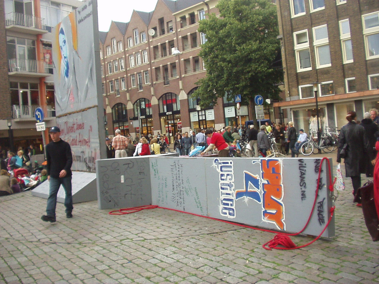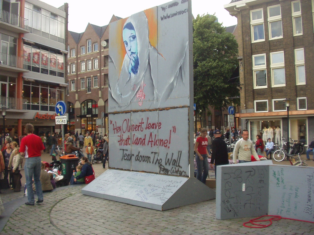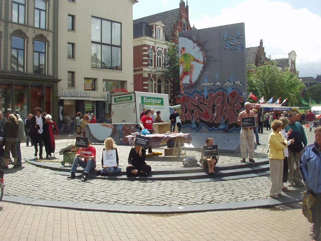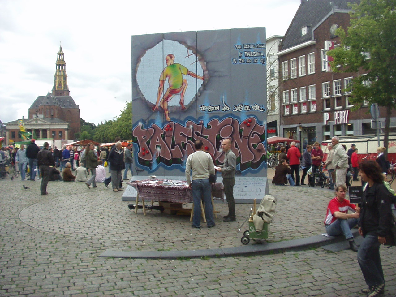 Op zaterdag 7 juli organiseerden wij i.s.m. United Civilians for peace een manifestatie op de Vismarkt in Groningen tegen de Muur die Israel bouwt op Palestijns grondgebied.
