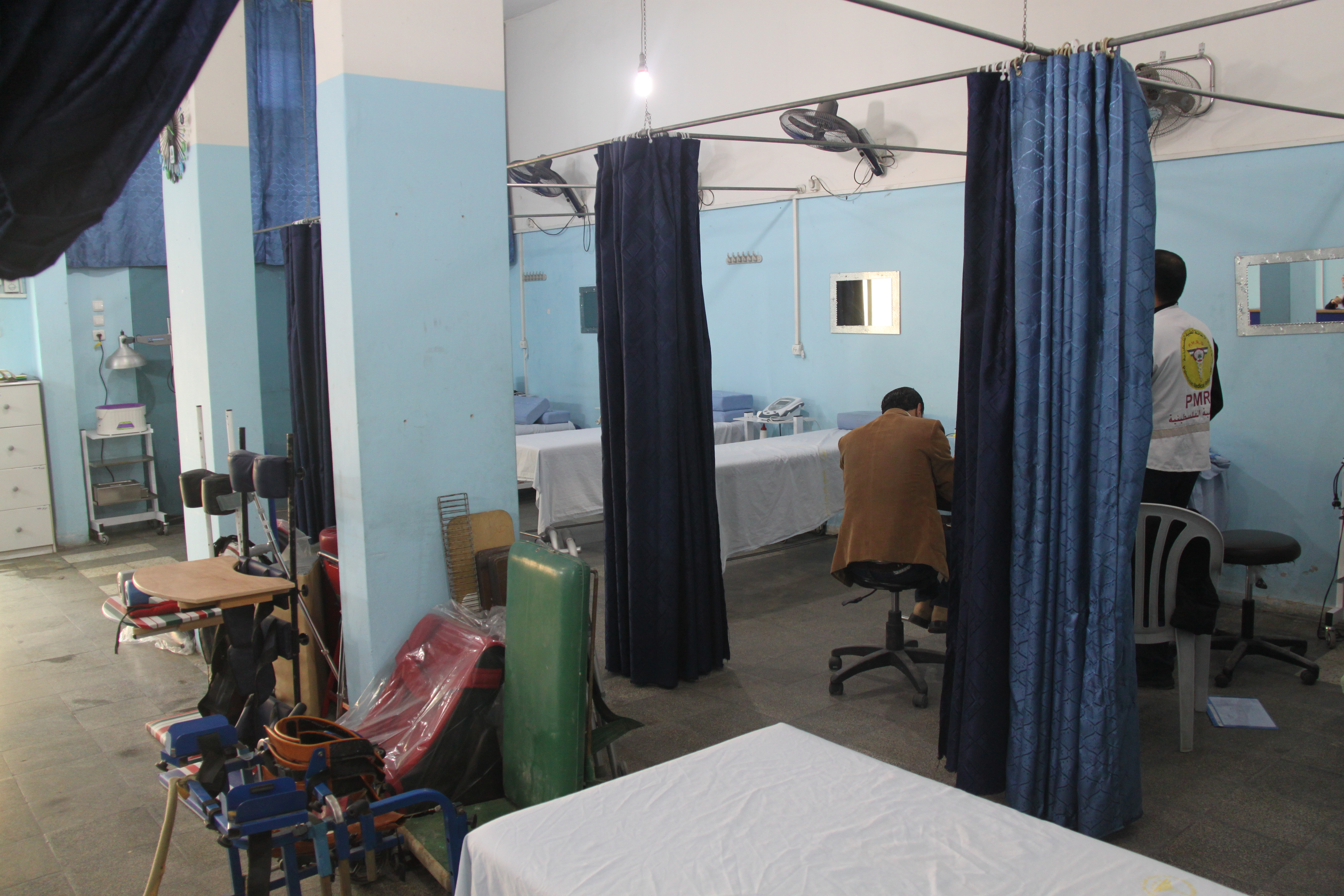 “We lopen tegen veel problemen aan in ons werk”, zegt Bassam Zaqout, de Projectcoördinator van PMRS. “Er is bijvoorbeeld een tekort aan reserveonderdelen voor de medische apparatuur die we gebruiken in de behandeling van patiënten. Deze onderdelen kunnen niet geïmporteerd worden omdat Israël de Gazastrook al jaren afsluit. Meestal is er een afwijzing of een verlate goedkeuring wanneer we proberen goederen in te voeren. Ook is het moeilijk om rolstoelen de Gazastrook in te krijgen.” Het chronische tekort aan voorzieningen zorgt ervoor dat de centra van PMRS niet alle zorg kunnen bieden die nodig is. Het team van PMRS biedt mensen zorg in revalidatiecentra en door middel van bezoeken aan huis. In het PMRS gebouw in Jabalya is het de hele dag een komen en gaan van patiënten en medewerkers. Mustafa Abed, manager van het revalidatieprogramma, geeft een rondleiding door de verschillende ruimtes. Er is een zaal met bedden waar wondverzorging en bewegingstherapie plaatsvindt. Daarnaast is een ruimte met eenvoudige fitnessapparatuur. Ook is er een speciale kamer ingericht voor kinderen.