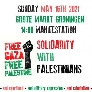 We roepen alle progressieve, antiracistische, antifascistische en antikolonialistische groeperingen en individuen op om zich op zondag 16 mei om 14.00 uur op de Grote Markt in Groningen te voegen om solidariteit te tonen met de bevolking van Palestina, en met alle andere mensen die lijden onder imperialistische agressie en kolonialistisch geweld.